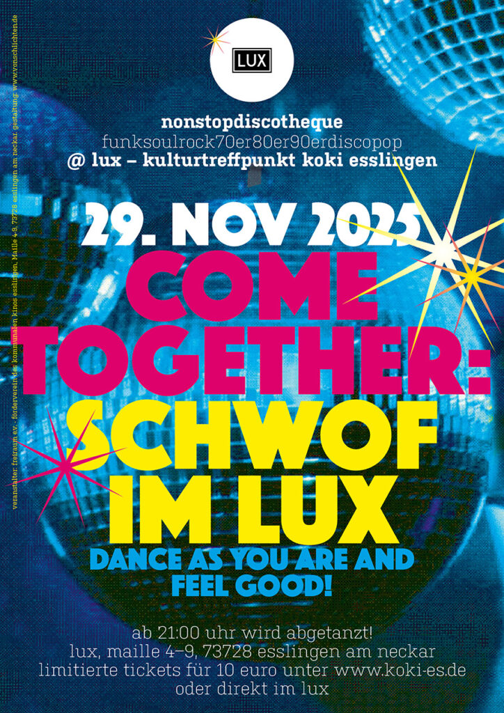 SAFE THE DATE! „COME TOGETHER: SCHWOF IM LUX – NONSTOPDISCOTHEQUE“, 29. NOVEMBER 2025 5. Oktober 2025NSD …FunkSoulRock70er80er90erDiscoPop… FRISCH, FREAKY, FUNKY.SAUGUT UND SEXY.ABTANZEN, ABGEHEN, ABHEBEN. …